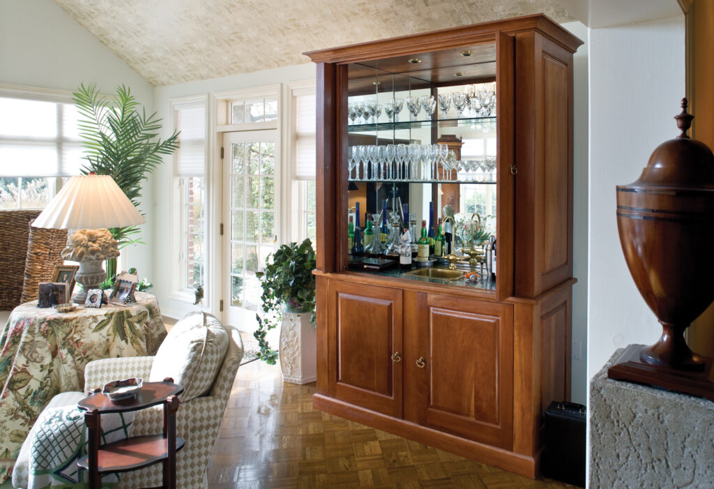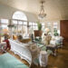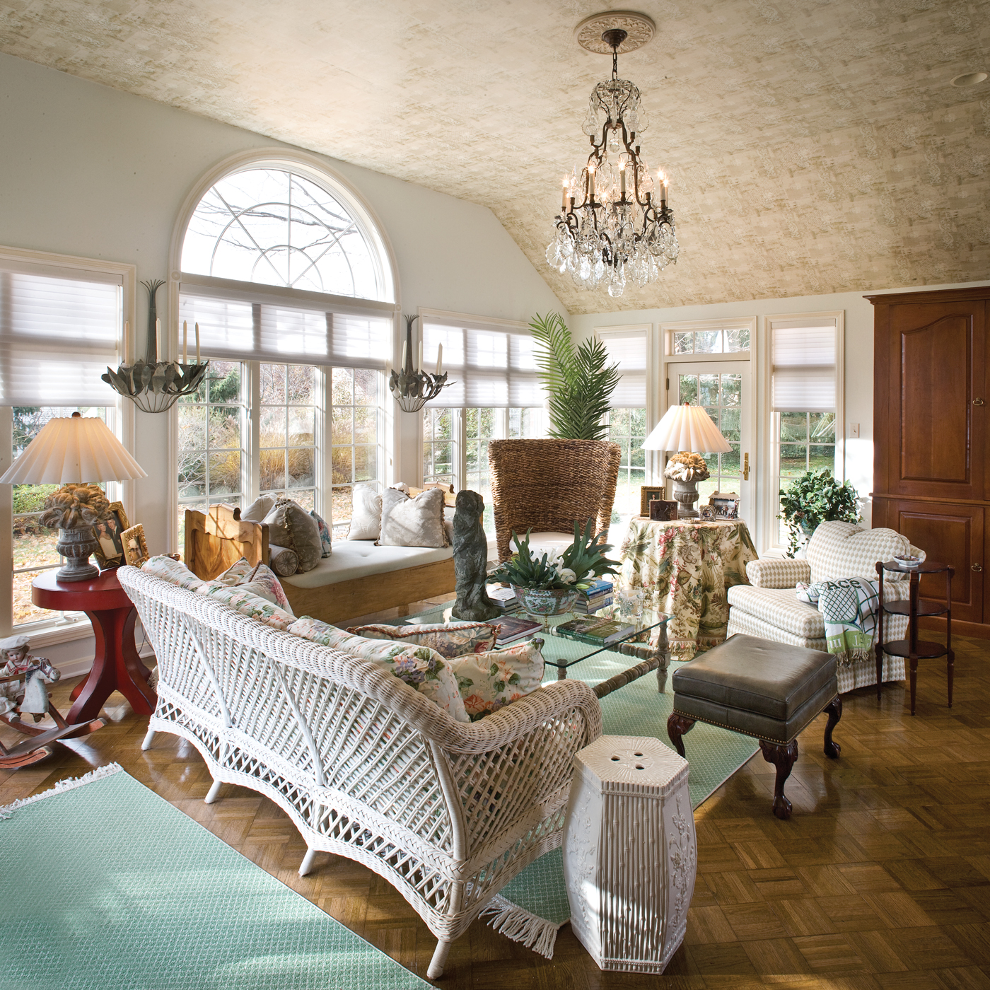 Garden Room: John layered the décor of the garden room to include a wicker sofa, a French daybed, Chinese porcelain, a Baccarat crystal chandelier, a handcrafted English-style armoire/bar, a Japanese side table, a Hamptons rush chair, a Paley club chair and a contemporary glass table. Hand-painted wallpaper defined the ceiling, while window shades provided privacy or allowed for a view of the garden. Note the mix of fabric patterns.