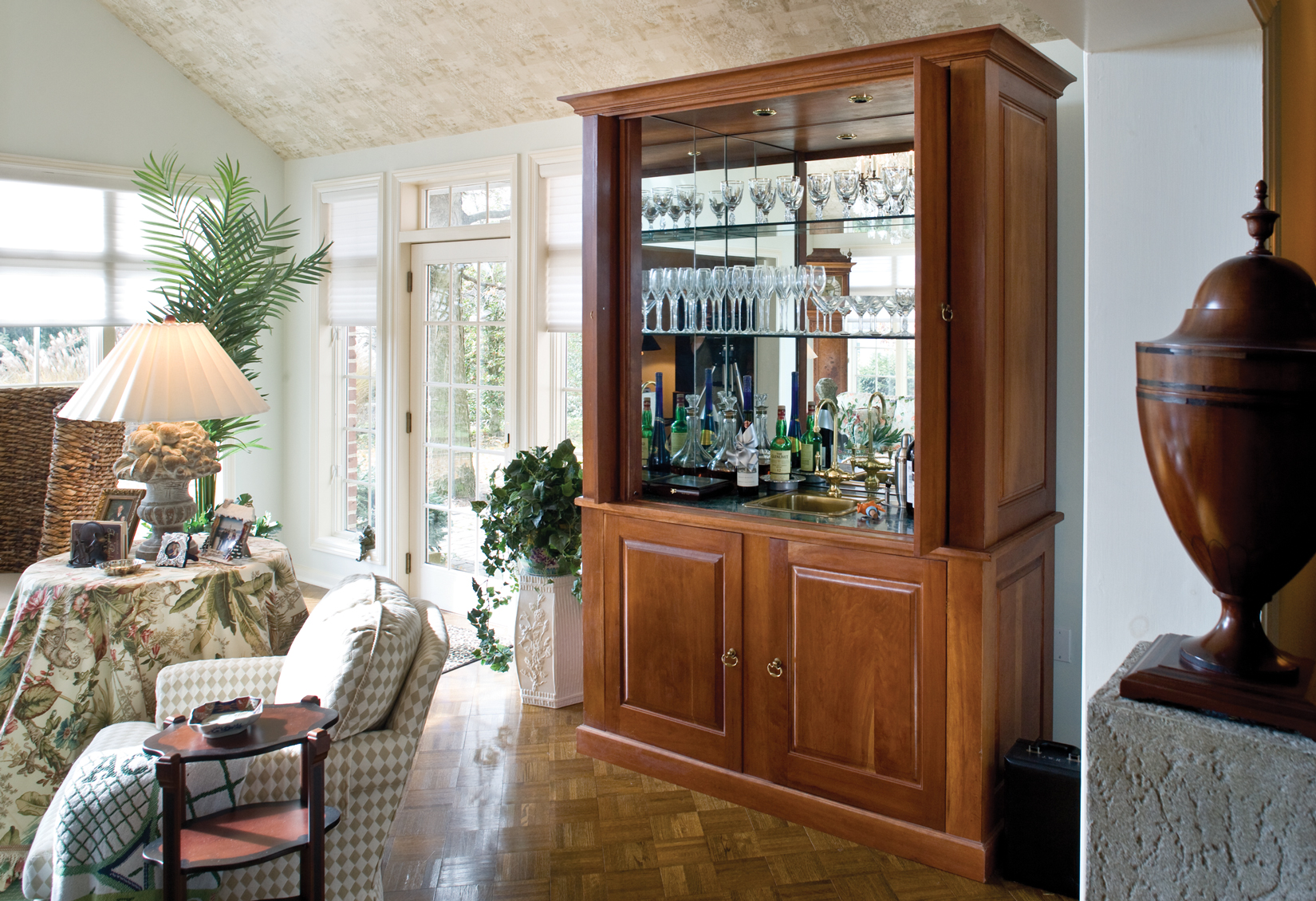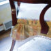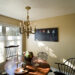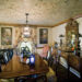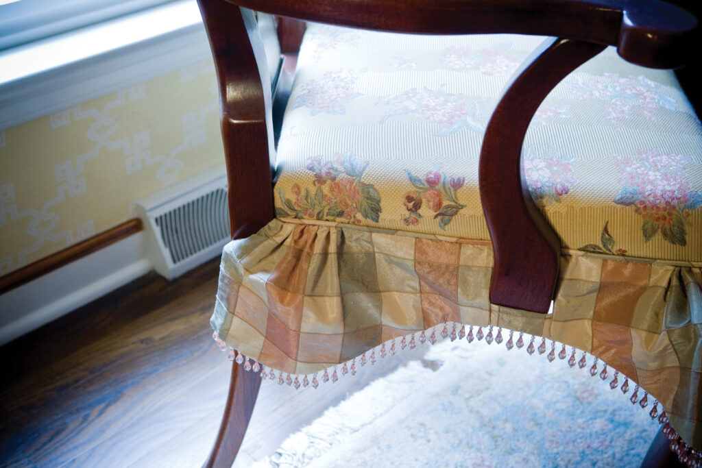 Dining Room: The classic dining room was anchored by a George III reproduction table and Queen Anne chairs, the seats of which were “petticoated” with contrasting/complementary fabric. Other elements include a Sheraton sideboard, Chinese porcelain, a George II mirror and a French Bombay commode. Again, the ceiling was papered and the moldings faux painted. The chandelier was discovered in the homeowner’s basement.