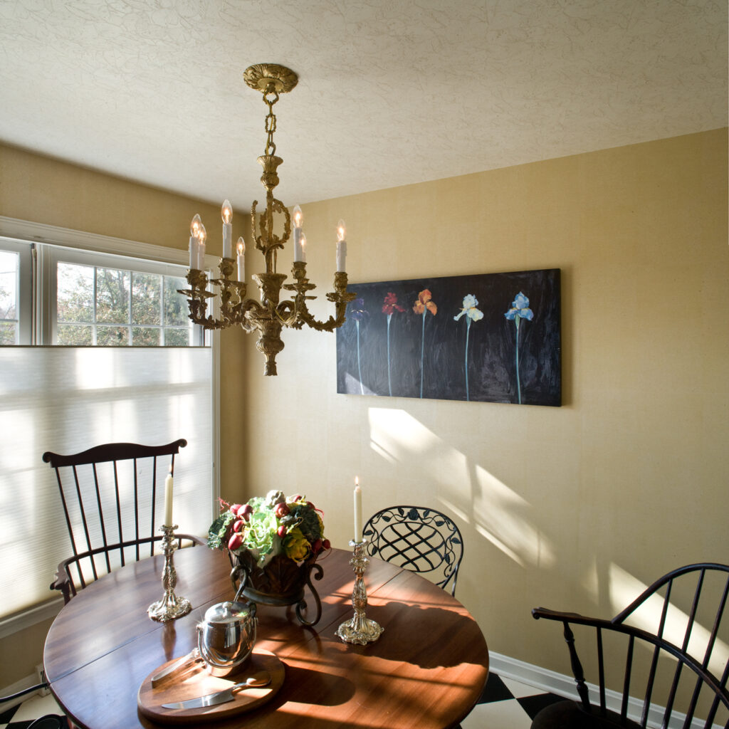 Breakfast Room: Even this simple breakfast room employed layering. The wallpaper mimics shargreen, a wall covering that was made from shark skin and was popular in the 1930s. The ceiling paper is embossed with acanthus leaves. The table is Louis XIV, while the armchairs were purchased at City Folk in Lancaster. The wrought-iron chair is mid-century Italian. The bronze chandelier is French 1920s. The Iris print is from artist Jim Dine.