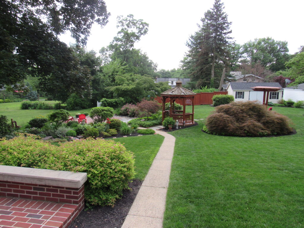 Kathy Hohenadel & Vickie Groff: A mix of perennials and shrubs serve as a backdrop for two ponds in this outdoor entertaining space. With a large tree removed, the upper pond is now bathed in sun and surrounded by new plantings. Featured artist: Janette Toth Musser.