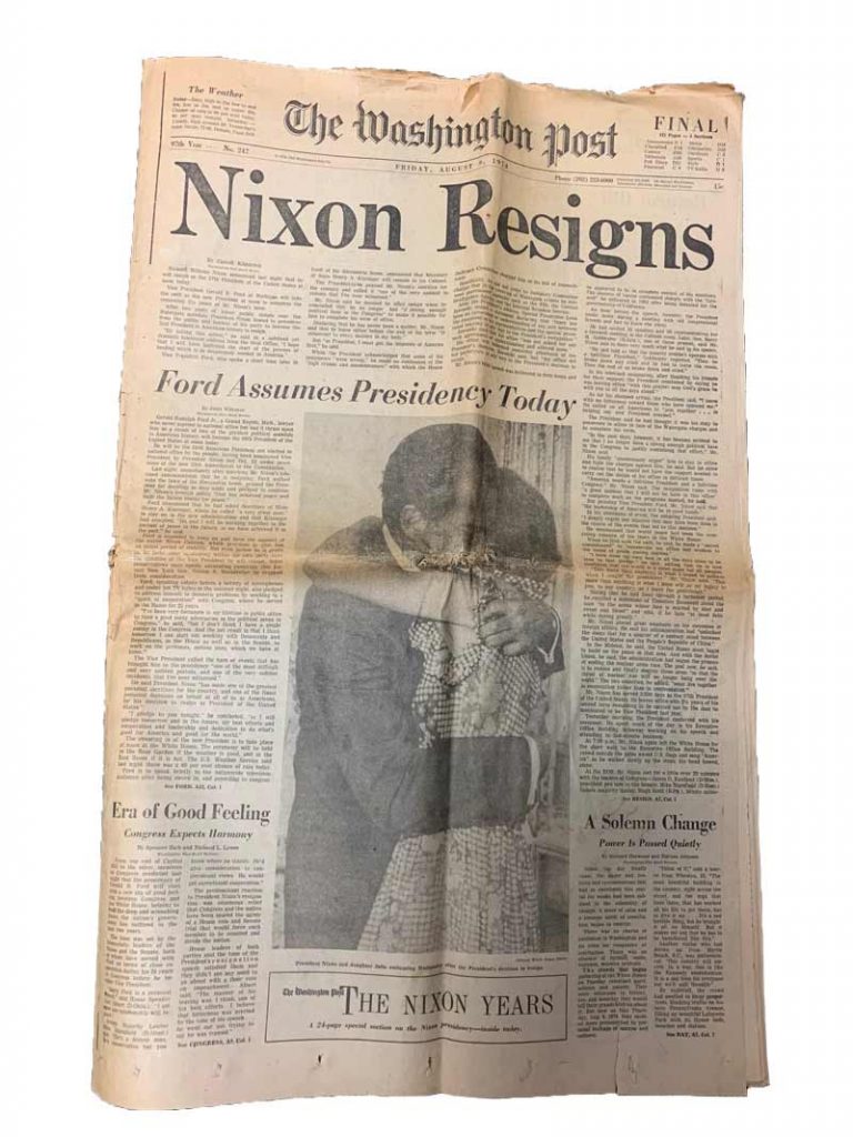 Several weeks ago, I was leafing through the July issue of Washingtonian Magazine. It contained a story that compared the nuances of the Baby Boom and Millennial generations. One of the comparisons involved keepsakes. It seems D.C. boomers treasure their deluxe DVDs of the movie, All the President’s Men that starred Robert Redford and Dustin Hoffman. While I don’t have the movie, I still have my copy of the book … plus a copy of the August 9, 1974, edition of The Washington Post. It’s a keeper!