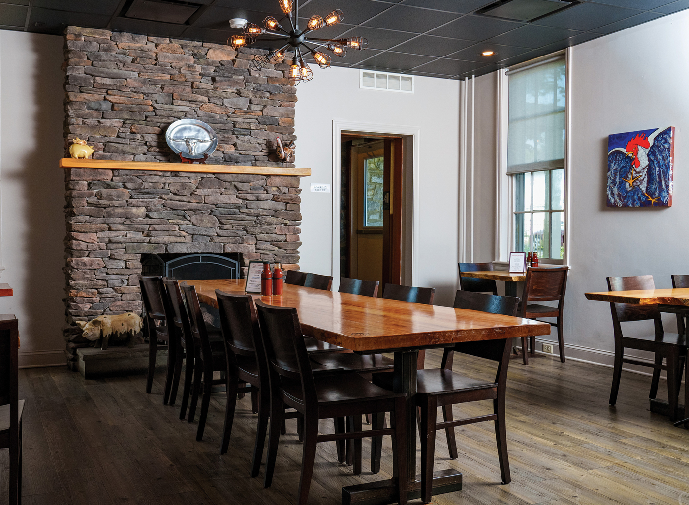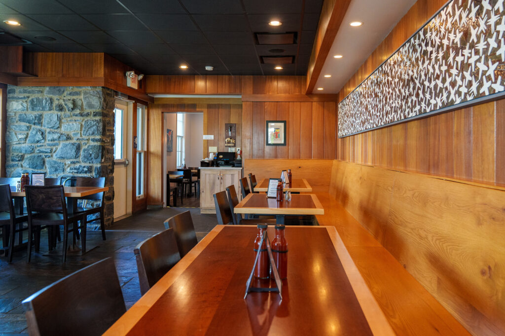The restaurant makes its home in what long-time Mount Joy residents may remember as the office of physician, Dr. David Schlosser. (Harvey was one of Dr. Schlosser’s patients.) The building dates to the mid-1800s but was renovated in the early 1960s. “Dr. Schlosser’s brother worked for a Philadelphia architectural firm, and the firm’s owner was friends with Frank Lloyd Wright, so the building has a lot of Wright-inspired elements such as the use of natural elements like stone and wood,” Harvey explains. The two fireplaces in the dining areas are original to the building, as is the mahogany paneling and the flagstone floor in the back dining room.
