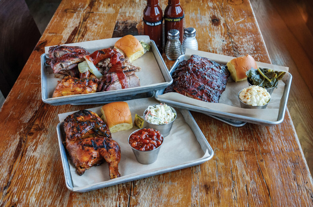 Popular menu items include brisket (available in a salad, as a sandwich or as a dinner), St. Louis-style ribs and pulled pork (available as a sandwich or a dinner). For those who can’t decide between brisket, pulled pork, ribs or Harvey’s Cajun sausage, there’s the Decision Maker, which features a sampling of all four meats.