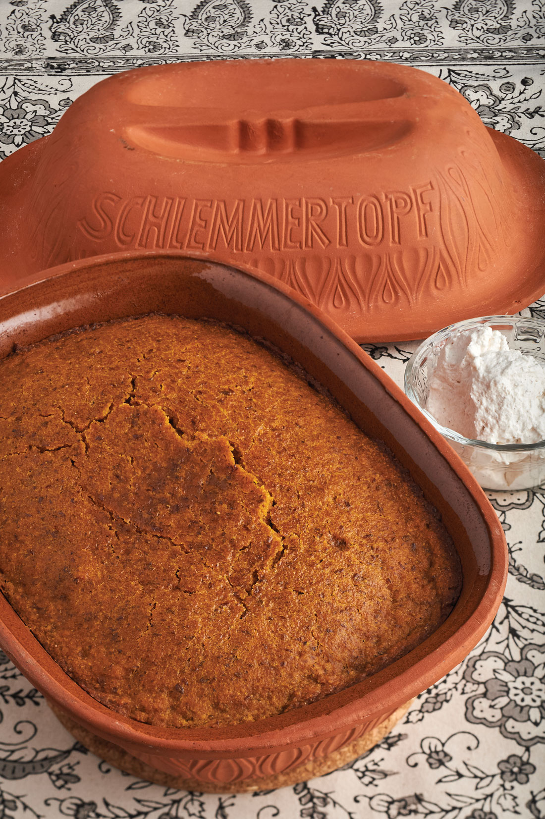 While any of the local bakers in my part of the county could identify me in a lineup, baking is my least favorite task in the kitchen. Compared to cooking, I find baking to be unforgiving, rigid and worst of all, once the process begins, there’s little to do in the way of course corrections.The benefits of a clay cooker stood out to me as a way of leveling the playing field. The steam produced by a soaked clay lid ensures the top of baked goods will be spongy. Surrounded by clay, bakes should be even – thanks to conduction, steam and being able to better handle fluctuations in oven temperatures. The porous quality of the clay retains less heat than a denser material that might cause it to burn. Not being able to see what’s happening underneath the lid forces me to trust the timer and keep the oven door closed, thereby retaining heat.