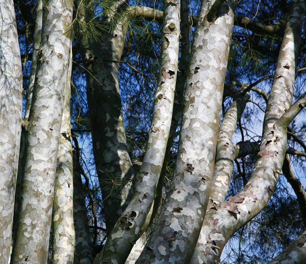 BARK: Its most ornamental feature is the bark, which peels in patches (somewhat like a sycamore, though not with that tree’s messy shedding) to reveal a patchwork of brown, gray, olive, light purple and white after the tree is 8 to 10 years old. Ancient trees become bone white. One could contend that it has the most beautiful bark of any conifer.