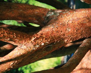 BARK: The bark is reddish to dark-chestnut-brown and exfoliates from the trunk and larger branches in long, thin strips revealing purple-red patches.
