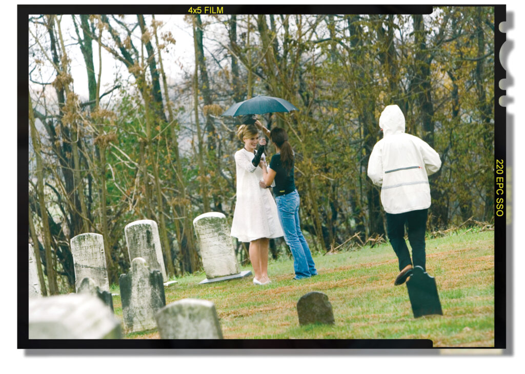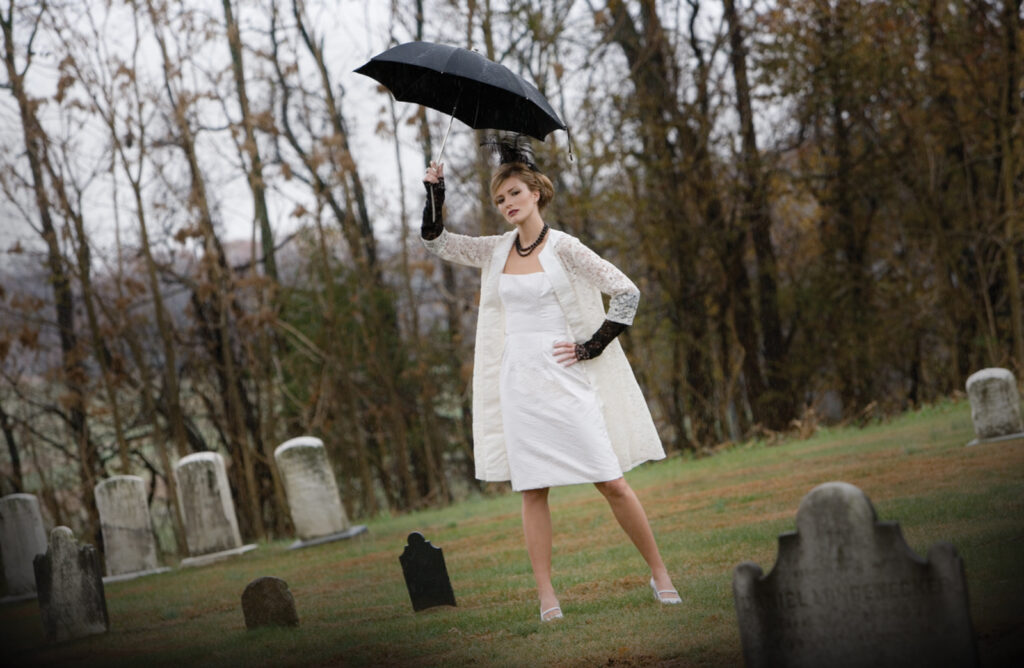 I arrived at Allan’s studio a nervous wreck. Janell, Anna and Claudia, however, were cool as cucumbers. The show had to go on and Janell assured us she would make it work. And, that she did. The rain actually worked to our advantage, as the misty conditions provided a beautiful backdrop for the pictures or we pivoted to interior spaces. (A traveling iron and ironing board ensured the gowns would remain perfectly crisp.) Anna even grabbed an umbrella and tiptoed around the graveyard at Boehm’s Chapel, alluding to the superstition that a little rain is good luck on a bride’s wedding day.