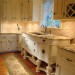 The floor is original to the house, while the upper cabinets date to the 60s. Glass found in the barn was used to add a touch of antiquity to a few of the cabinets. Molding designed and crafted by Kevin served the same purpose. Rubbed bronze fixtures add to the look.