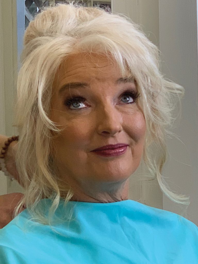 For Connie’s makeup, Bobbi’s plan was to create a dewy, sun-kissed look that extended to rosy lips. The softened smoky eye was enhanced with false lashes. Connie reports that people often tell her she looks like Erika Jayne, one of the stars of The Real Housewives of Beverly Hills. Photo by Sue Long.