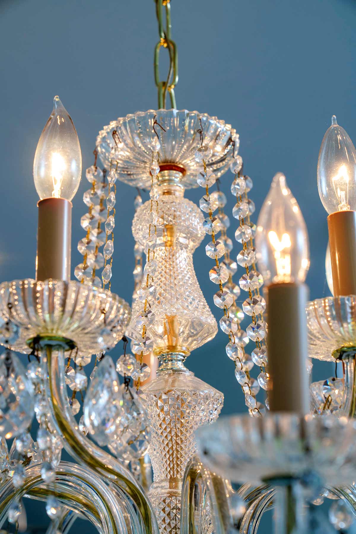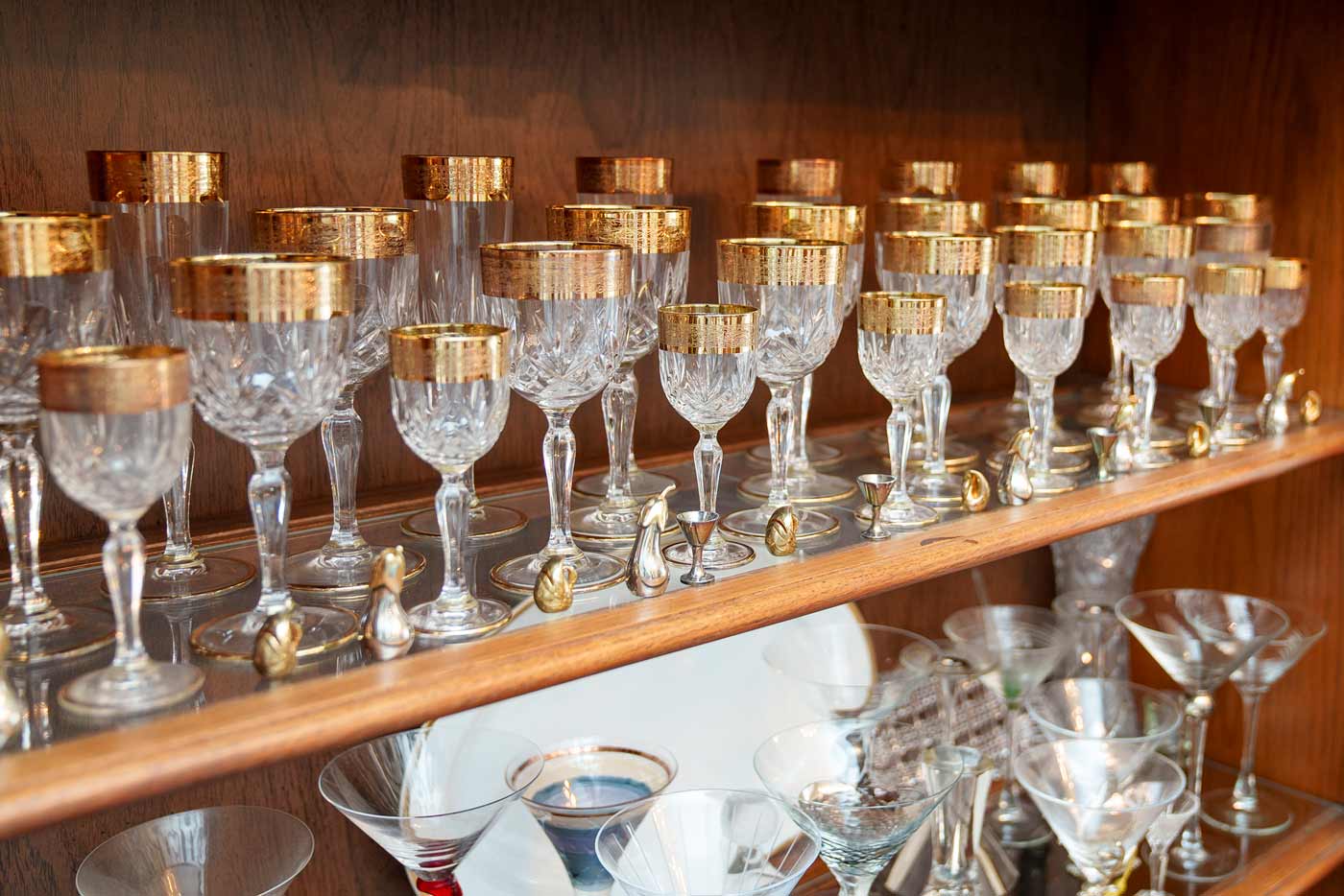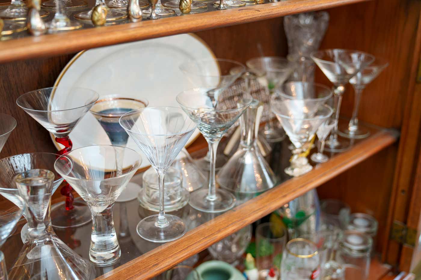 One of their first purchases as a married couple was a beautiful crystal chandelier for their dining room, and for sentimental reasons, they knew it had to make the move to Luther Acres. It now hangs in their dining room space and complements the hutch that displays Lloyd’s collection of martini glasses and Brenda’s collection of stemware purchased from an antiques shop in New Orleans. Meanwhile, the corner cupboard holds Lloyd’s grandparents’ china set, as well as crystal pieces collected by Brenda over the years.