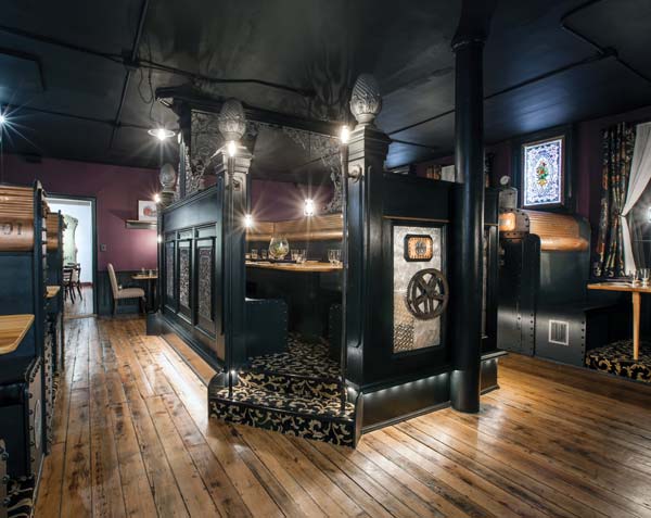 The parlor bar, which combines hints of modern elegance with Victorian charm, is home to a beautiful fireplace, shining hardwood floors, a wide bar and hi-top tables. The main dining room combines casual with a bit of steampunk. Seating is a combination of booths and tables. Although one of the dining tables is in the center of the room, there’s privacy as guests step up into a semi-enclosed booth – Bowden describes this particular space as having a hint of steampunk.