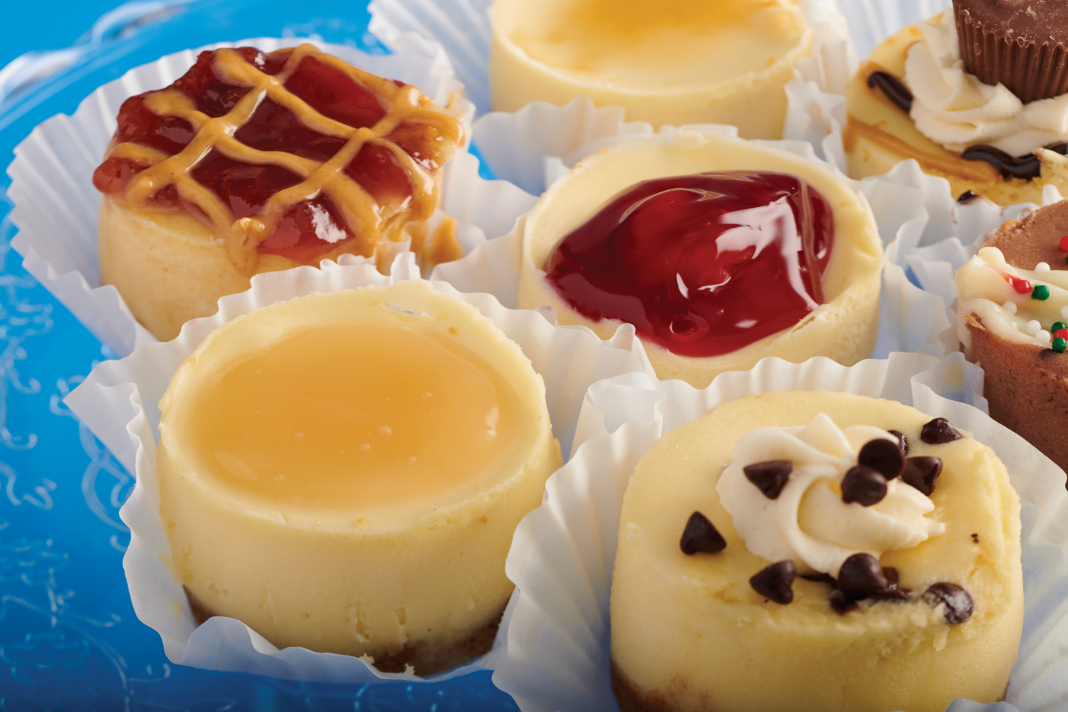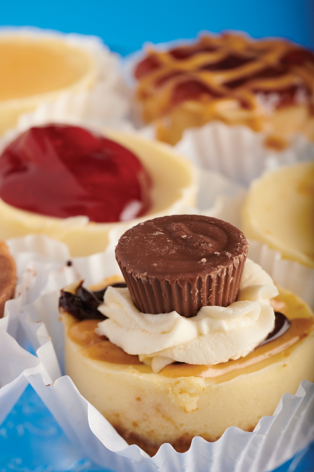 Clockwise from top left: Mini-cheesecake flavors include Peanut Butter & Jelly (strawberry preserves), Classic, Peanut Butter Cup, Double Chocolate, Cannoli, Lemon Curd and, in the middle, Cherry with an Oreo bottom.