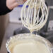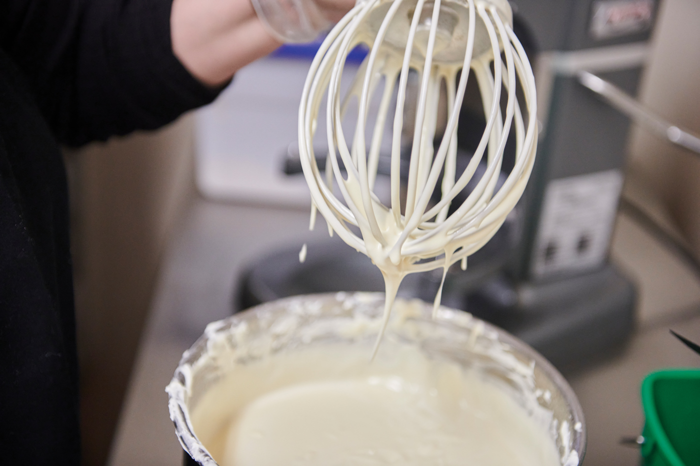 The cheesecake base is mixed carefully, combining the core ingredients of cream cheese, eggs, sugar and vanilla.