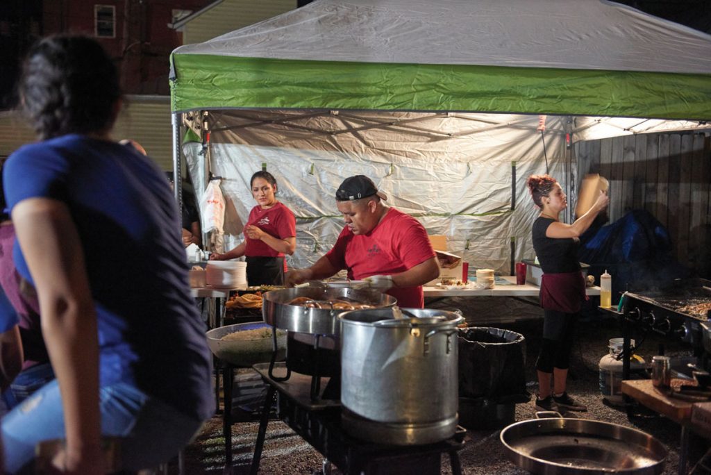 Jennifer Suárez, chef Erik Suárez, and Tamara Donoso cook and fill orders for a long line of patrons at Chilango’s Taco Night.