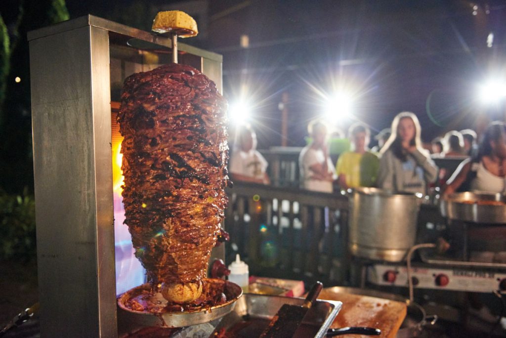 Al pastor (pineapple pork) cooks on a vertical broiler with savory pineapple juice marinating the slow-roasting pork.