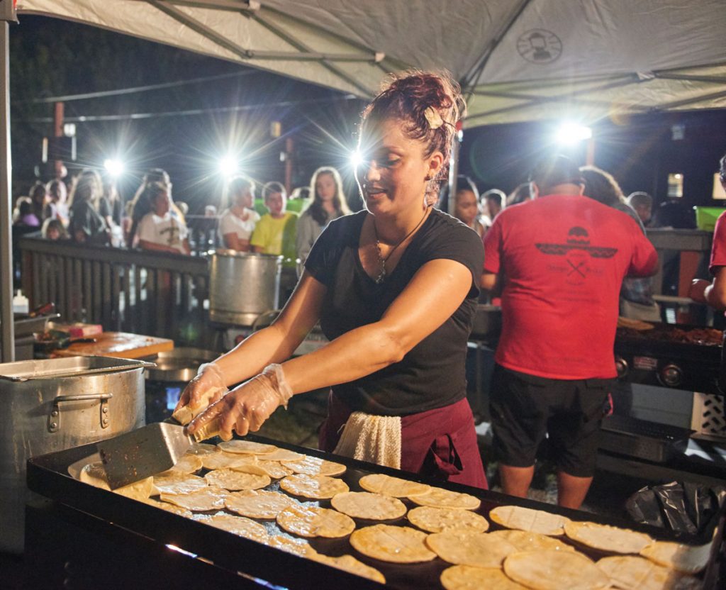 Tamara Donoso grills tortillas on a hot griddle ahead of a long line of hungry customers.