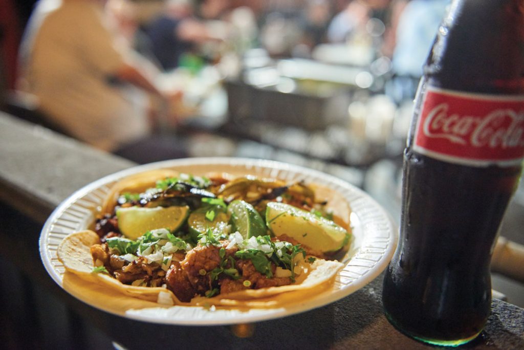 All four varieties of tacos are available with spring onions, lime, tangy grilled cactus and an ice-cold bottle of Coca-Cola.