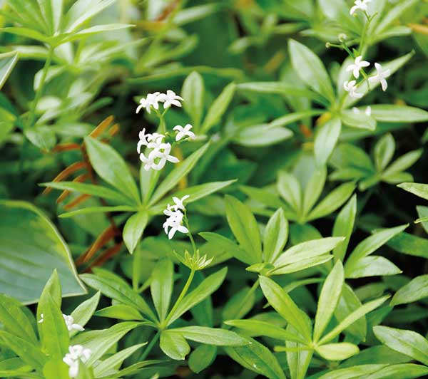 Also doing well in partial to full shade is the old-fashioned sweet woodruff, Galium odoratum. It will be dormant over the winter but quickly emerges in the spring, making an attractive ground cover as it spreads by both creeping roots and self-seeding. The flowers in May are white and very showy. The plants emit a strong odor of freshly mown hay when the foliage is crushed or cut. The aromatic intensity increases when dried, thus dried leaves are popularly used in sachets or potpourris. Its pressed foliage was used by German colonists to scent linens (in German it is called “waldmeister,” which translates as “master of the woods.”) Plants have also been used commercially in perfumes. The leaves are sometimes used to flavor teas and cold fruit drinks. It has traditionally been used to make May wine, a punch made from white wine flavored with woodruff, orange and pineapple.