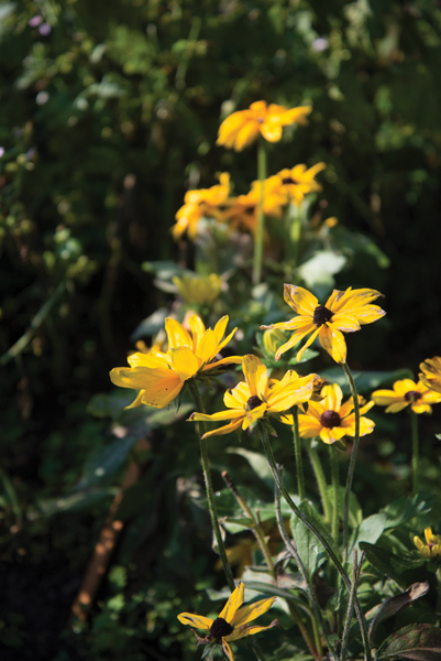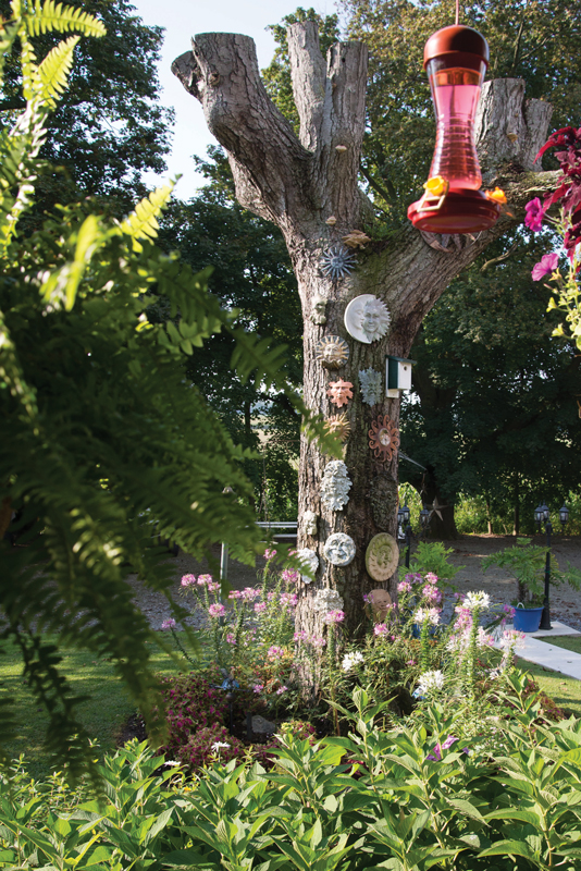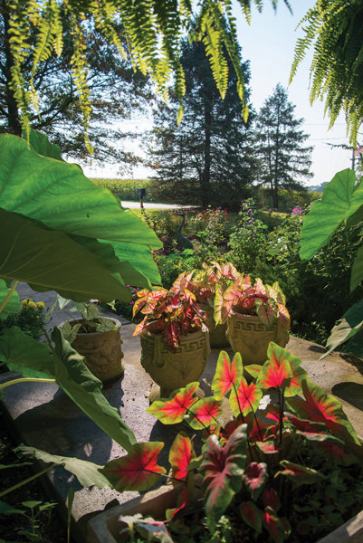 Caring for the gardens is labor-intensive. Each fall, the 80 houseplants that spend the summer on the porch – snake plants, Christmas cactus, umbrella plants, angel wing begonias and rubber plants – must be moved back into house. “They pretty much take over the dining room,” Shirley remarks. The 100 or so elephant ear tropicals are dug up and stored in the cellar. In the spring, the job is reversed.