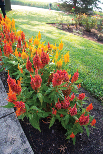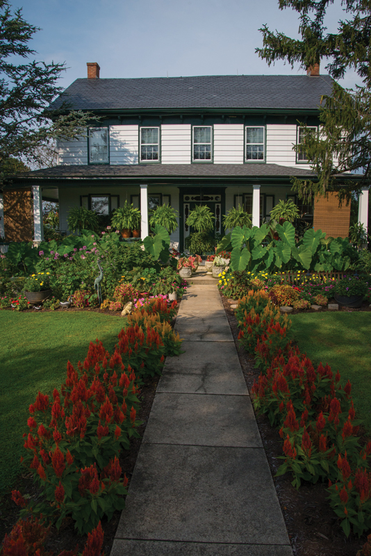 The gardens that surround the house are now filled with perennials, annuals and tropicals. The long walkway that leads to the front door is typically flanked by eight dozen geraniums – last year, however, she switched it up and experimented with celosia. “I liked it, but I prefer the geraniums,” she says, adding that Doug complimented their return for the summer of 2018. “He never comments on anything!” she says.