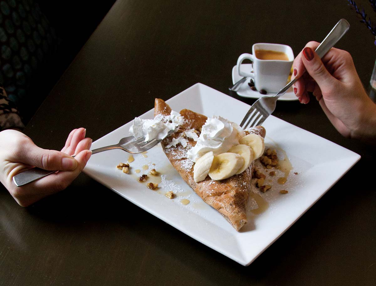 Of course, Rachel’s is known for its crepes; the menu features both sweet and savory varieties. Sweet crepes, which are filled with fruit, butter and sugar, nutella or ice cream, are the perfect choice for dessert. Savory crepes make for hearty breakfast or lunch items. “You can put almost anything on a crepe,” Rachel comments.