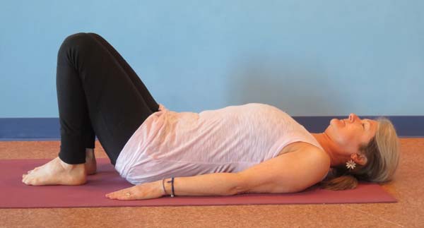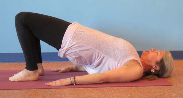 Exhale, press down with the feet and lift the pelvis up. Bear the weight of the body on the feet, arms, upper back and back of head. (Keep weight off the neck).