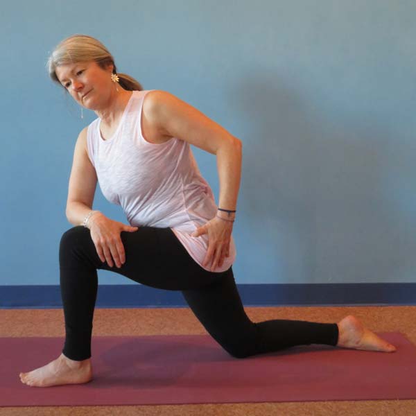 Keeping the spine long, rotate the front ribs towards the inside of front leg.
