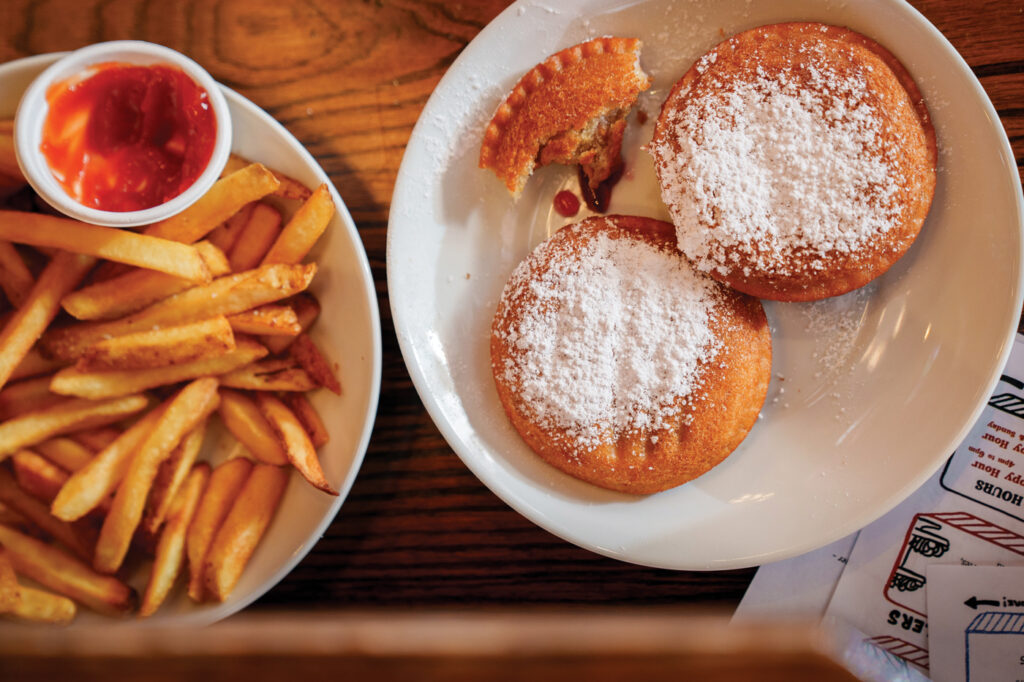 There’s a curated beer menu with 24 craft brews on tap. A variety of wines are available by the glass (6 oz. pour) or bottle. Decades also has an extensive craft-cocktail menu (with some tasty mocktails, too). Several of the cocktails are served in pouches. “We’ve had people describe the cocktail pouch as an ‘adult Capri Sun,’” Jonathan remarks. “It was created during Covid by our bar manager, when restrictions only allowed us to sell cocktails ‘to-go.’ After the restrictions were lifted, we liked the pouch idea, so we kept it for in-house sales. The pouches work really well for guests playing arcade games,” he adds.