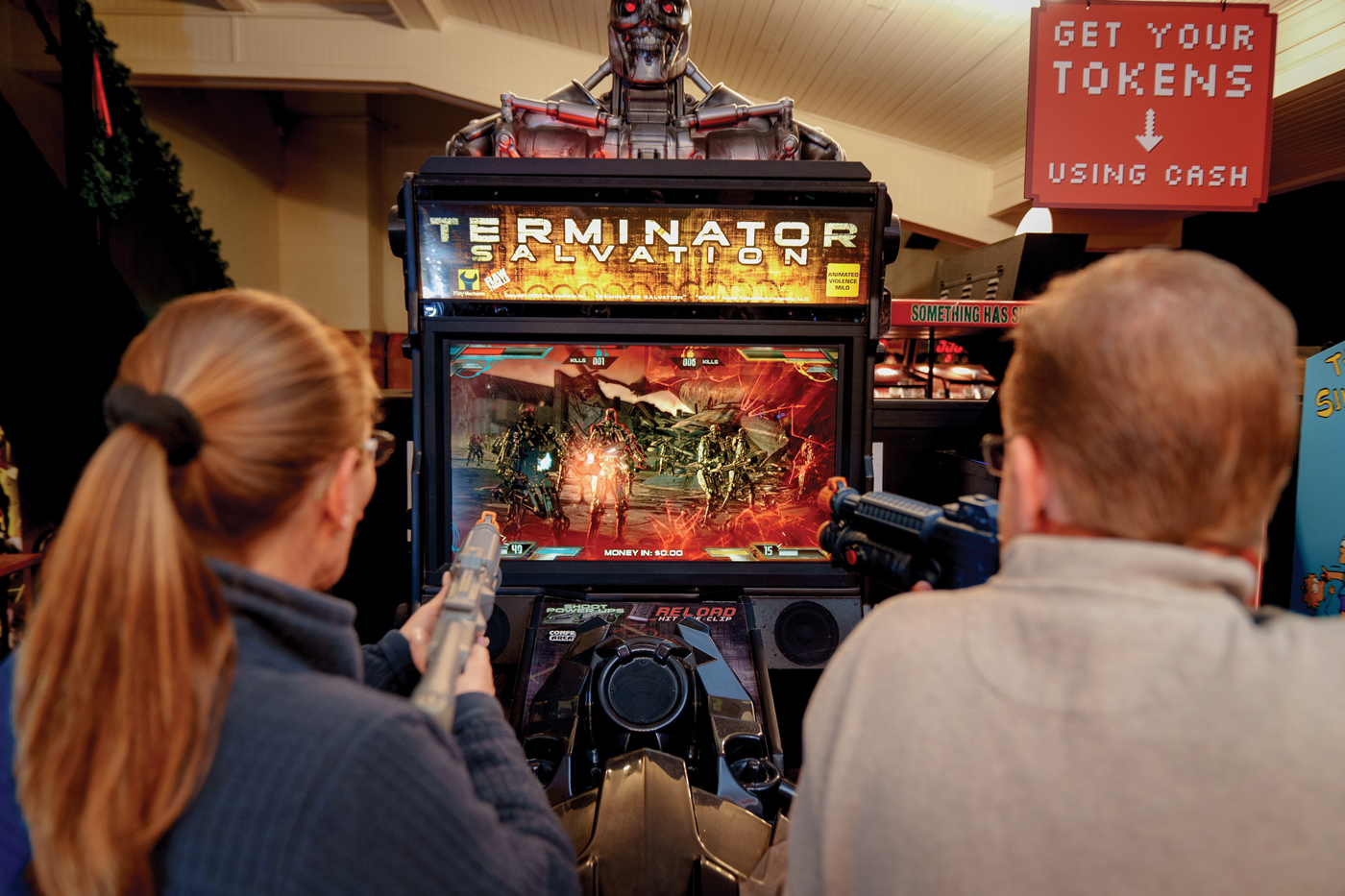 There are also 40-plus retro arcade games, including four full-size Skee-Ball lanes (in keeping with the retro feel, wooden balls are used for Skee-Ball). For the comfort of guests, small drink stands, which were custom-made, are positioned near each game, as well as between the Skee-Ball lanes. Arcade games use Decades tokens, which are 25 cents (most games use one or two tokens).