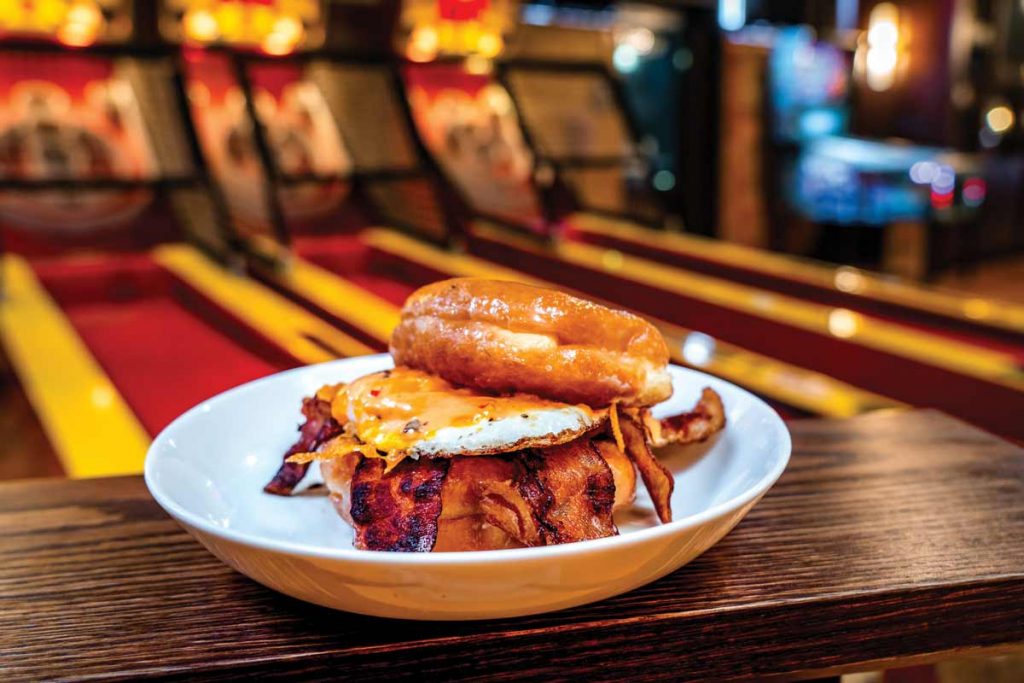 The building was constructed in two phases in the 1920s and ‘30s and is on the National Registry of Historic Places. The National Guard left the space in 2010; it served as the performance venue for Theater of the Seventh Sister for several years. Today, the space is filled with the sounds of bowling balls colliding with pins, laughter as guests challenge one another at arcade games and the conversational buzz of guests sharing food and beverages. “In our unique space, you have an interesting experience even before you order food,” Chris says.