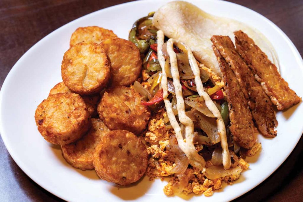 The Vegan Breakfast (scrambled tofu, hash browns, veggie tempeh bacon, sautéed onions and peppers, griddled tortillas and vegan ranch).