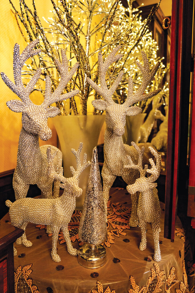 Animals: While deer still rule, Anita reports that bears have staged a comeback. You’ll be seeing both of these forces of nature depicted in ornaments, accessories, dinnerware and outdoor décor. “Bears are perfect for a lodge look,” Anita points out. Andrew utilizes deer of all sizes throughout his house at holiday time. Birds are also popular.