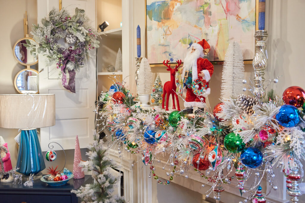 A mantel at Heritage Design is decked out in nontraditional colors.