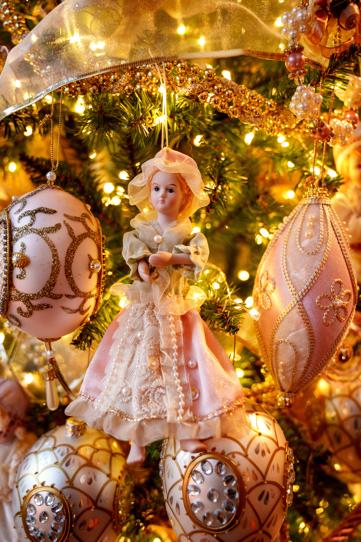 Trees in Every Room: No, not floor-to-ceiling specimens; table-top trees of all sizes and made of metal, glass and other materials can bring a subtle holiday touch to any room. That applies to guest rooms … a touch of Christmas will add a warm and welcoming feel to any guest room. As seen here, Andrew adds trees to his guest rooms; this design harkens to the Victorian era, as it is decorated with dolls, creamy-hued ornaments and gold cording.