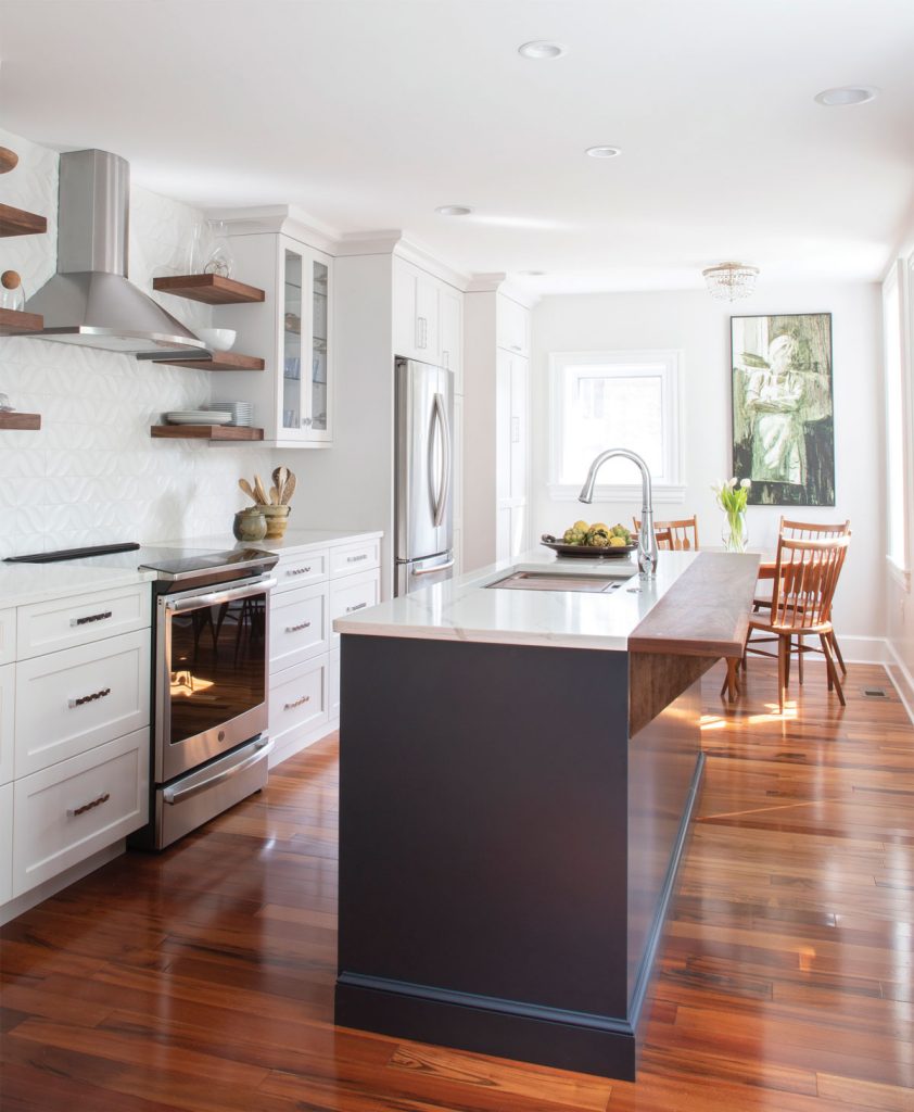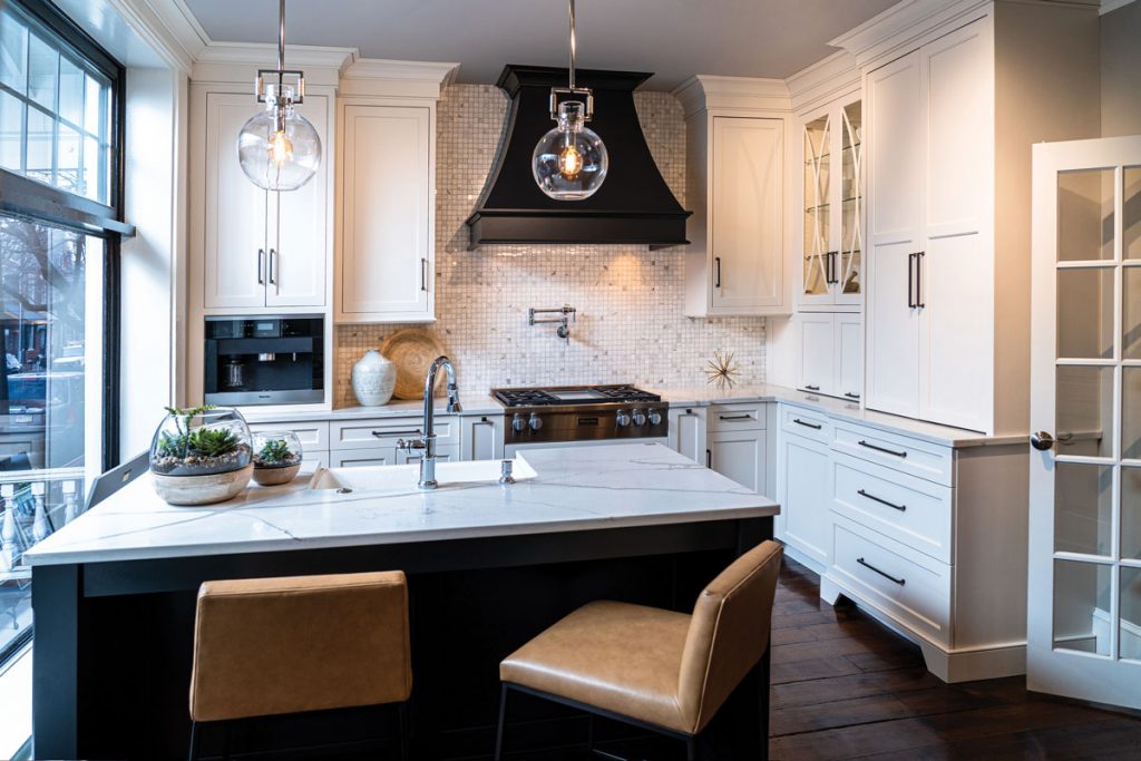 Backsplashes that travel to the ceiling are also in vogue. Quartz has become the counter covering of choice, “especially if it resembles marble,” he adds.