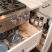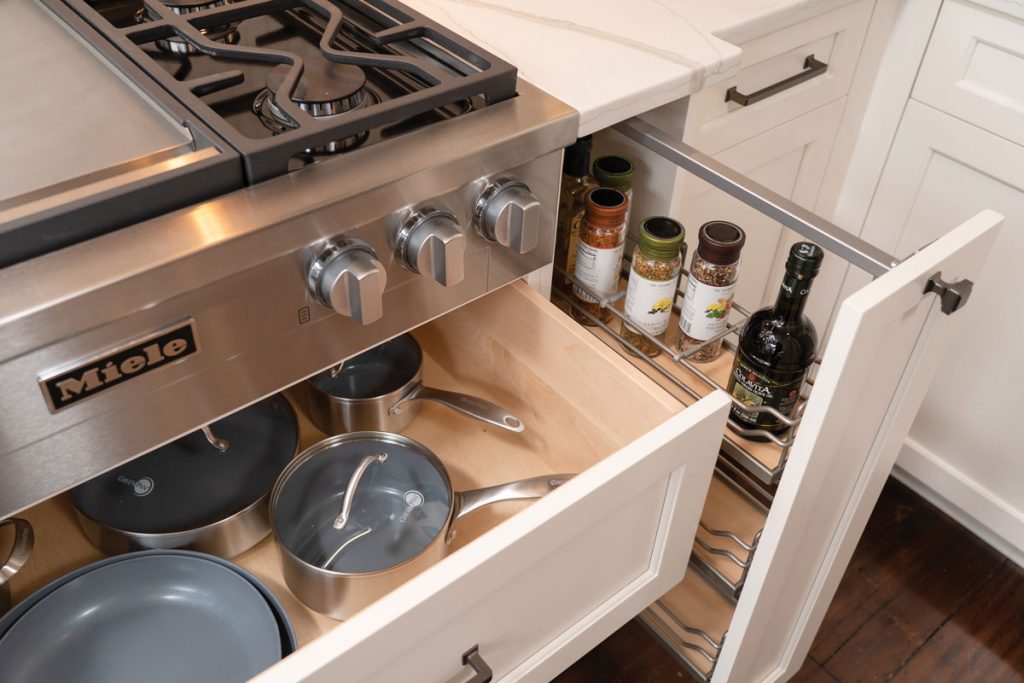 Garage-style cabinets ensure that items such as toasters, coffeemakers, mixers, canisters etc. can be put out of sight once they are no longer needed. Stoves are surrounded by pullouts that hold herbs and cooking oils. Deep drawers allow space for oversized pots. Cabinet interiors are designed to store and easily locate cookie sheets and other baking items. Pantries provide storage for everything from food to linens, china and glassware that are used for special occasions.