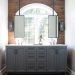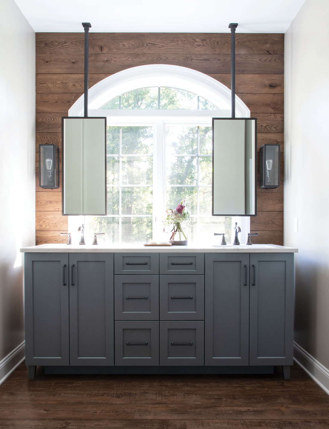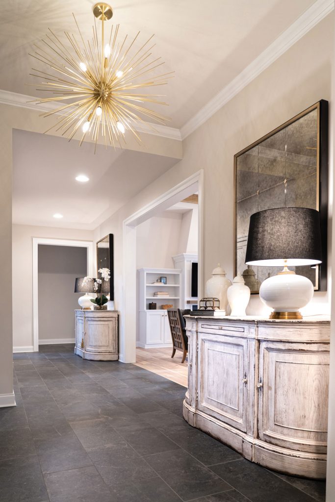 The Martins’ gallery-style hallway echoes Laurie’s love of all-things French. The floor tile mimics stone, while the cabinets, mirrors and lamps have a Euro feel. The starburst lighting fixture taps into the reemergence of gold, which is being widely seen in accessories, lighting, plumbing fixtures and door/drawer pulls.