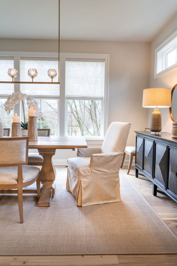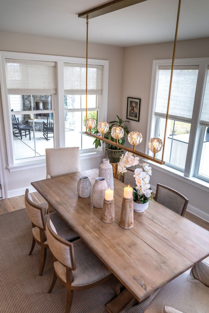 The fourth element is a dining room whose ambiance is what Liz calls “California casual” due to the comfortable seating, farmhouse table, unique lighting fixture, retro-style buffet and cotton window shades. It offers a view of the expansive outdoor-living area and backyard that is often filled with deer at sunset.