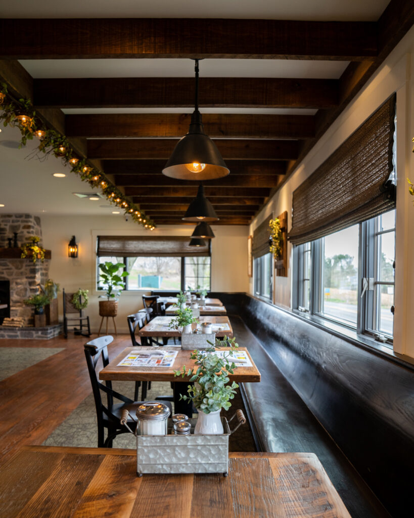 Although The Brickerville House seats 225, it is divided among a series of dining areas that create a sense of warmth and coziness. The dining area off the entry is known as the General Store. This cheery area features exposed stone walls and rafters. Seating is via booths and a counter. The light-filled, L-shaped Porch features a flagstone floor and is a great place to watch the pedestrian activity at the adjacent Bricker Village. The area also houses shelves filled with coffee beans that may be ground and purchased. The Library, with its faux bookshelves, is situated between the Porch and the General Store. Behind the General Store is the Fireplace Room, which has exposed stone walls, wainscoting and a Colonial-style stone fireplace. To the rear is the light and airy Garden Room.