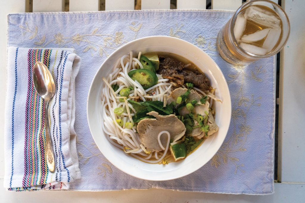 From Sprout Rice & Noodles: Bun Bo Hue, a soup from central Vietnam featuring spicy pork and beef served in a fish stock with noodles topped with Vietnamese cilantro.
