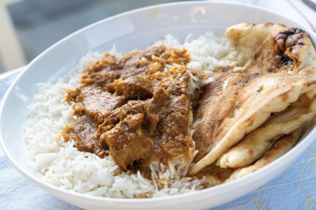 Himalayan Curry and Grill: Lamb curry, rice and Naan bread.