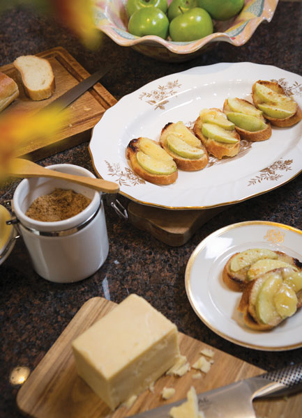 Her must-have recipe is a savory-sweet hors d’oeuvre she calls “Granny Crostini,” a decades-old classic from Bon Appetit magazine, which is made with green Granny Smith apples and crusty bread, topped with white cheddar cheese and toasted. Simple to assemble, they can be ready in minutes.