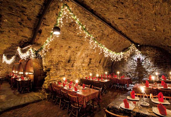 Each of the restaurants on the property – the Bottling Works, the Catacombs, Bube’s Biergarten and Alois – highlights a different aspect of Alois Bube’s operation and all offer some type of entertainment. “We try to provide an experience that’s unique in a historic place that’s extraordinary.” Sam explains. The Bottling Works, a casual-dining area, is located in the brewery’s former bottling plant. Adjacent to it is Bube’s Biergarten, an outdoor oasis with large trees, landscaped areas and an oversized chessboard. The two share a menu. The Catacombs, a fine-dining venue that also is the backdrop for the various themed feasts, is housed in the stone-lined vaults of the brewery’s aging cellar 43 ft. below ground. Wooden tables, pewter-like plates and mugs, and candlelight add to the aura of being cut off from the world. “We’ve created a really romantic atmosphere in the Catacombs,” Sam remarks. Alois, which is located in the original bar and dining rooms of the Victorian-hotel portion of Bube’s Brewery, is the venue for Bube’s murder mysteries and also is available for private parties. Photos of Alois Bube and his family provide an informal welcome in the entry area, and each of the rooms features hand-stenciling and other painting techniques. The crowning glory is the parlor that houses not only the Central Hotel’s original bar, but also a game table that is original to the hotel.
