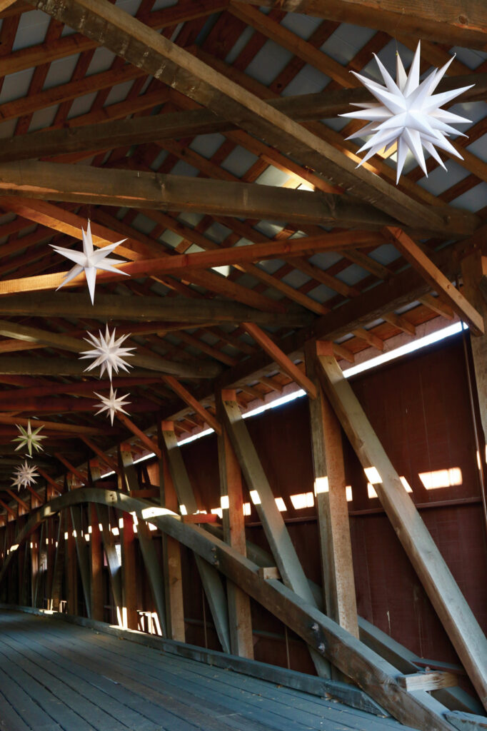 The Pinetown Bushong’s Mill Covered Bridge off Route 222 is illuminated by Moravian stars at holiday time.
