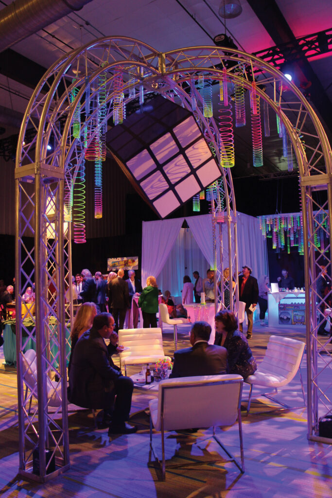 Listrak’s in-house party-planning committee worked in tandem with Stray Productions, as they sourced most of the nostalgia-inspired centerpieces including Rock ’em Sock ’em Robots and fiberoptic lights. Stray’s crew suspended a giant Rubik’s Cube and a sea of neon Slinkies in the cocktail areas to enliven the bar and seating areas.