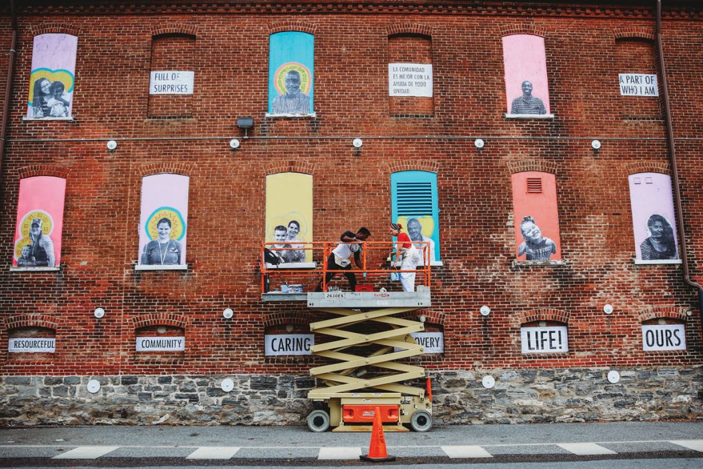 Their mural project included a lot of community engagement. Neighbors and park regulars contributed to the subject matter and were asked to sit for portraits that would become part of the building’s façade. “The most rewarding thing is seeing folks’ faces light up when they see their work on display or their faces reflected in a mural,” she says of the work on Water Street.