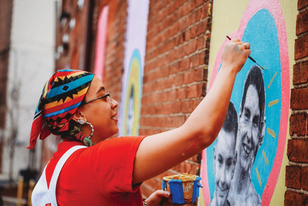 alina works on one of the mixed media portraits of local residents for the “This Neighborhood is …” mural project on the façade of the Water Street Mission building. Photo by Michelle Johnsen.