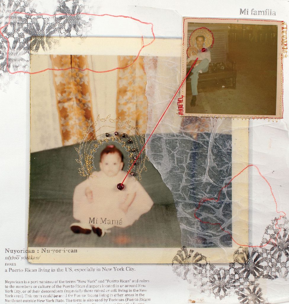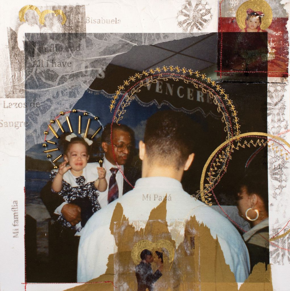 Salina’s personal work reflects the mapping of her connection with her family’s history, Latinidad culture and Dominican and Puerto Rican heritage, through collage and mixed media. She often sources material from her family momentos and photos.