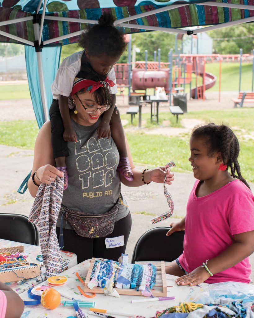 Salina balances work with play while demonstrating a weaving technique with neighborhood kids at Culliton Park. Photo by Sarah Code Kroll.