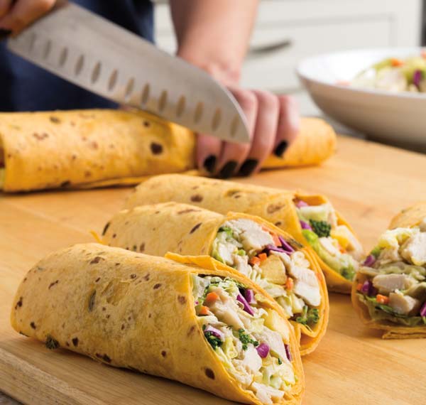 On a hot day, a cold, no-cook dish is super refreshing. Save time by using pre-cooked grilled chicken strips. Throw in some tropical flavors and you’ll be transported to an exotic destination. Here, pineapple and a zesty, crunchy cabbage slaw combine with the chicken strips and wonton noodles to create an exciting-to-eat wrap that is perfect for lunch or dinner at home or on the go.